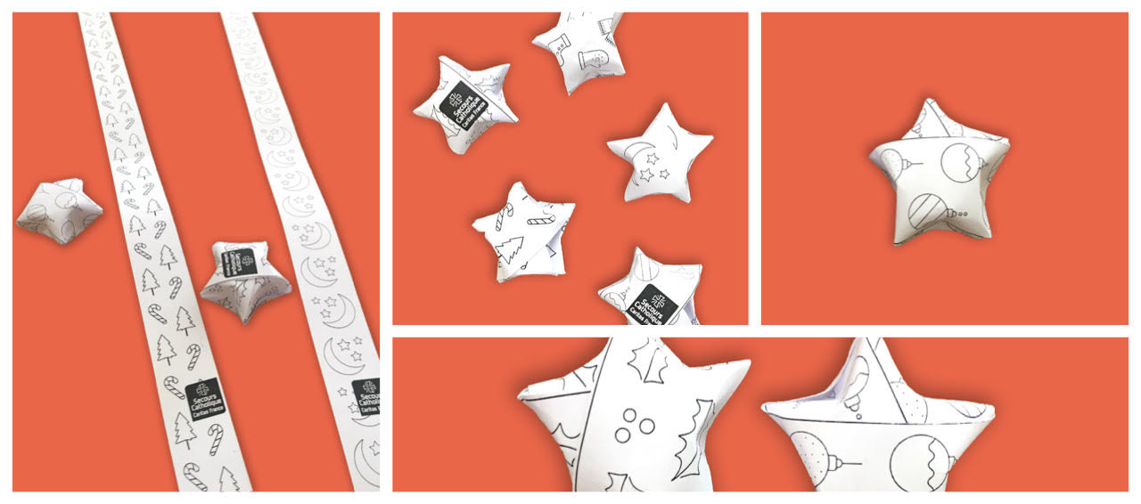 À imprimer, découper, colorier et plier, les origamis en étoiles permettent de décorer la classe, la table de Noël ou la crèche.